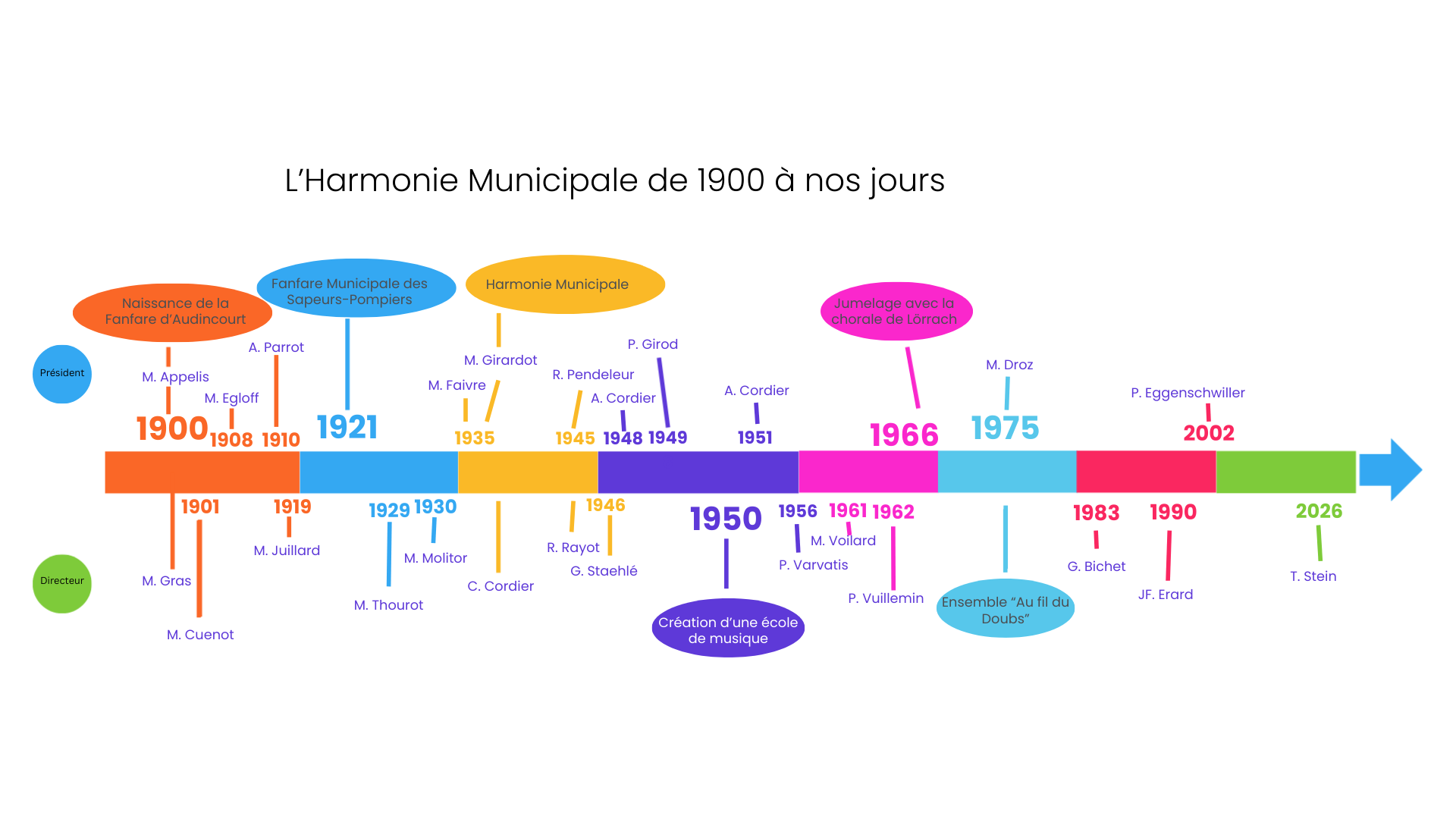 Aujourd’hui, Philippe Eggenschwiller, le président actuel, et Tanguy Stein, directeur artistique, poursuivent la tâche de leurs prédécesseurs : mener l’Harmonie toujours plus haut, assurer la relève grâce à une école de musique de qualité, permettre aux musiciens de se retrouver et de partager leur passion de la musique dans une ambiance chaleureuse et conviviale.